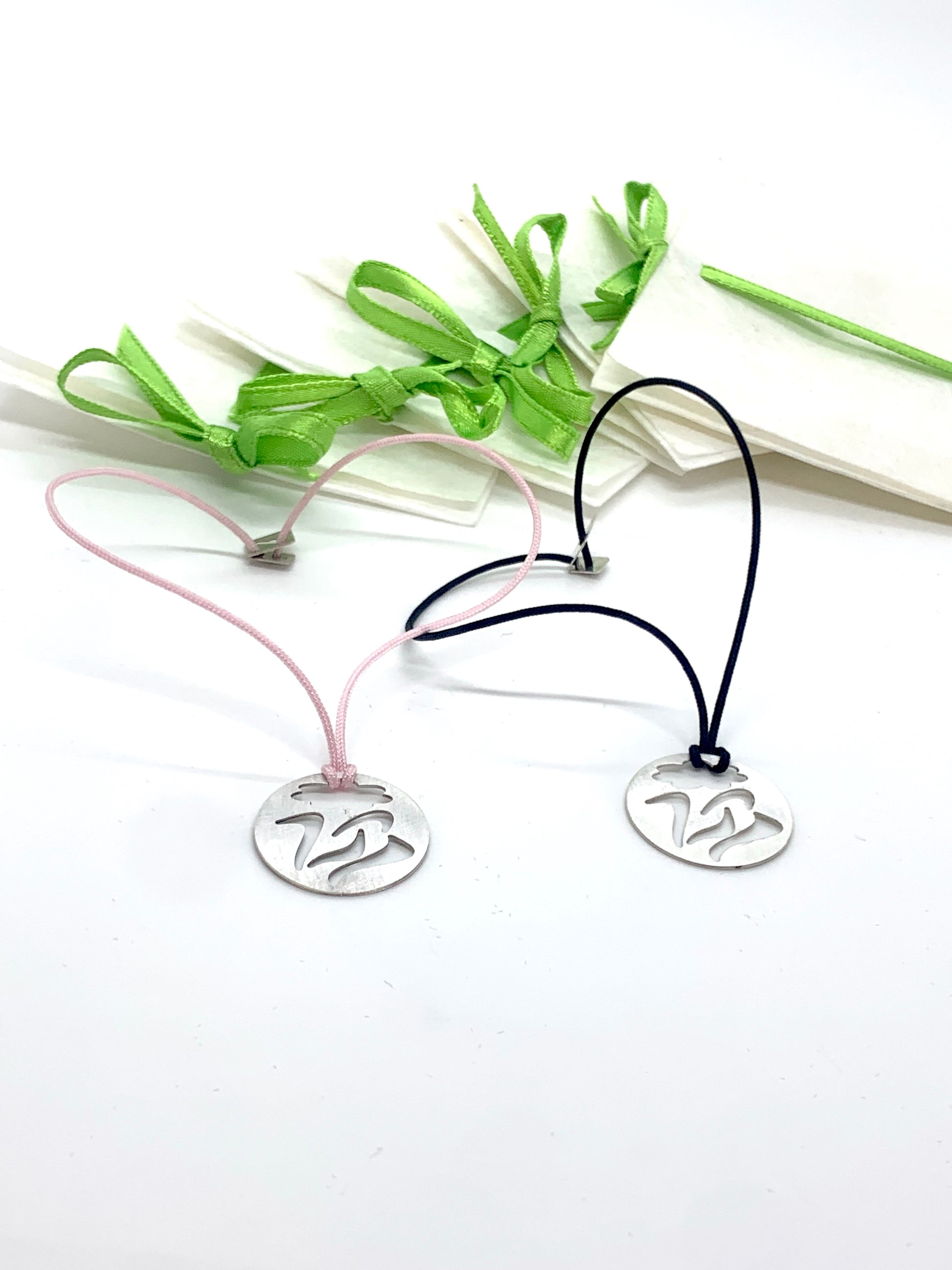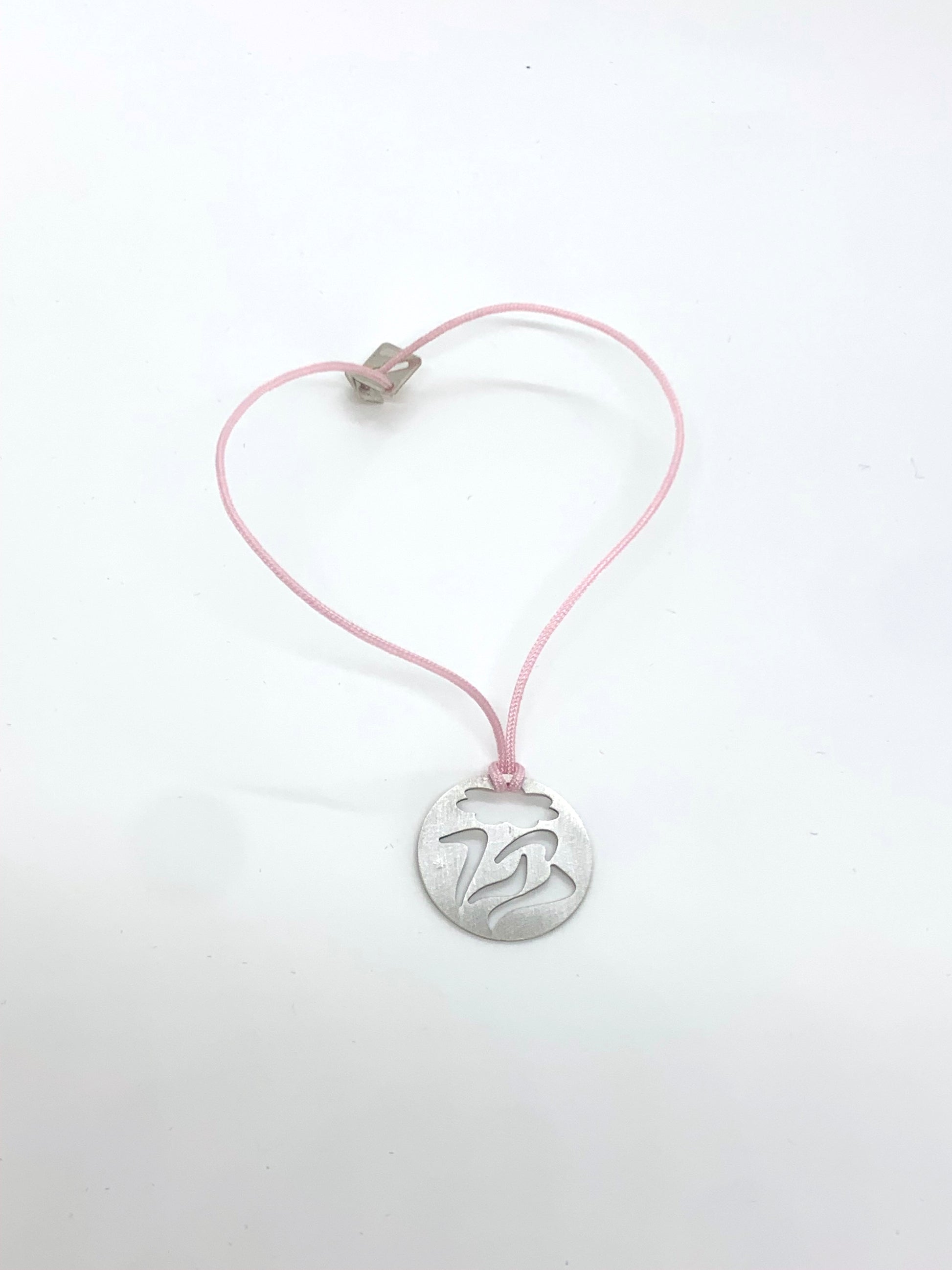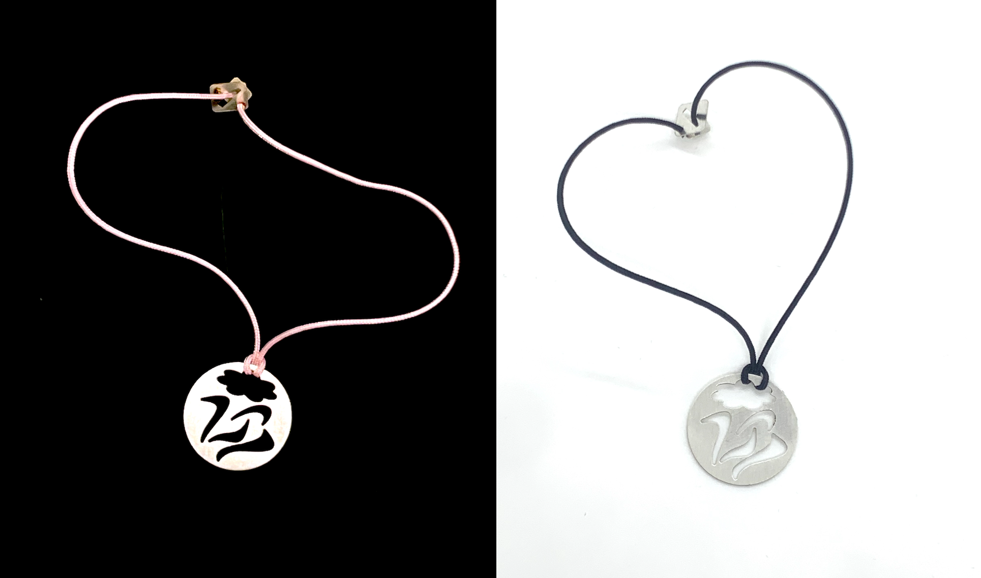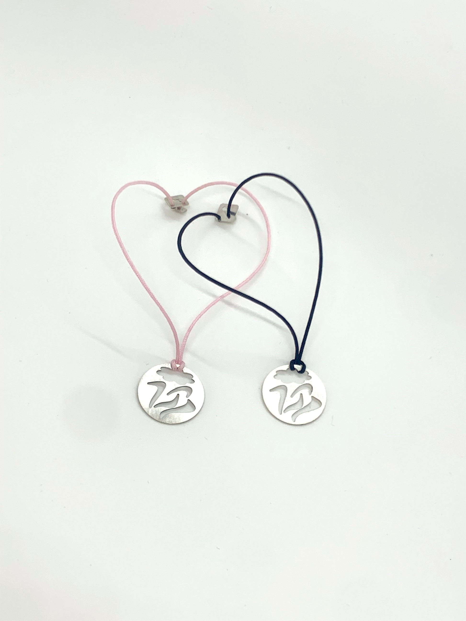 The charm bracelet is offered in two colors of strings; black and pink.